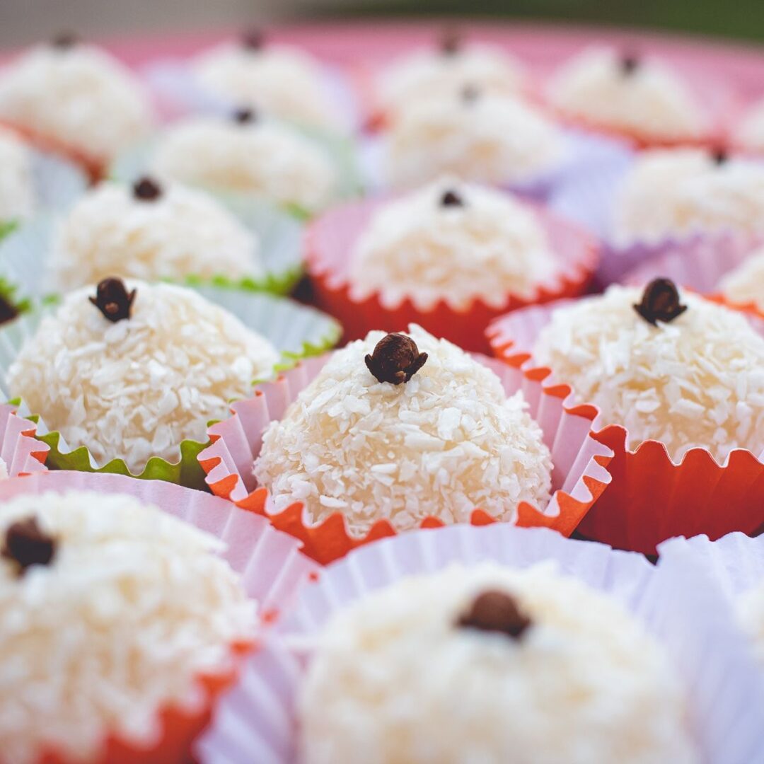 O beijinho é outro clássico indispensável. Feito com coco, ele combina muito bem com festas infantis delicadas, como temas de princesas, unicórnio ou ursinho.